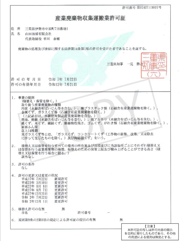 産業廃棄物収集運搬業 一般廃棄物収集運搬業 浄化槽清掃業 浄化槽保守点検業 |